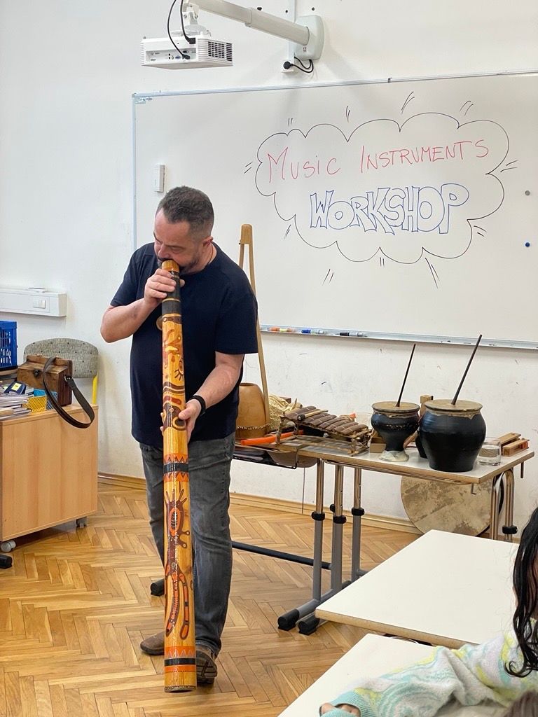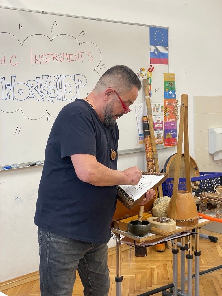 V petek, 24. 1., smo učenci P5S in P5E z gospodom Darkom Korošcem ustvarjali v glasbeni delavnici. Uvodoma nam je razložil, zakaj se je odločil za obisk naše šole. Pokazal nam je nekaj glasbil iz vsega sveta. Izbral je tri učence, ki smo glasbila lahko preizkusili. Med njimi sem bil tudi jaz, zato sem bil zelo vesel. Na odru smo zaigrali dež, grom in veter na plaži. Ko smo vse te zvoke združili, je zvenelo kot pravi veter in je bilo zelo sproščujoče. Kasneje smo začeli izdelovati ropotuljo. Dobili smo glinene posode, vrv in mokro kozje usnje, ki smo ga z vrvjo pritrdili na posodo. Na koncu smo ropotulje odnesli v razred in jih tam pustili, da se je usnje posušilo. Mislim, da smo se vsi zelo zabavali.