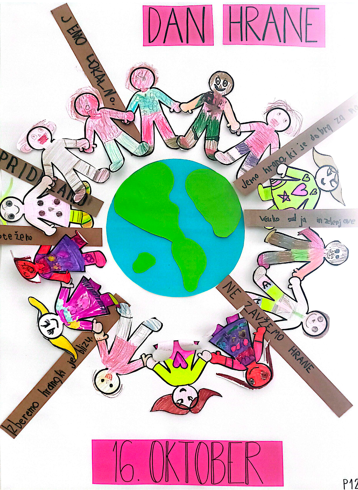Učenci so razmišljali o tem, kako lahko z odgovorno izbiro hrane prispevamo k bolj trajnostni prihodnosti planeta. Posebej smo poudarili pomen lokalno pridelane in sezonske hrane. Da bi to idejo bolje razumeli, so prisluhnili zgodbi o jabolku in banani ter primerjali pot vsakega sadeža od trgatve do trgovine. Po pogovoru o sporočilu zgodbe, ki se je povezovalo z geslom letošnjega svetovnega dneva hrane – Z roko v roki za boljšo hrano in boljšo prihodnost – so učenci sodelovali v ustvarjalnih delavnicah, kjer so uprizorili in ilustrirali zgodbo, izdelovali plakate ter raziskovali teme, povezane s hrano in okoljem.